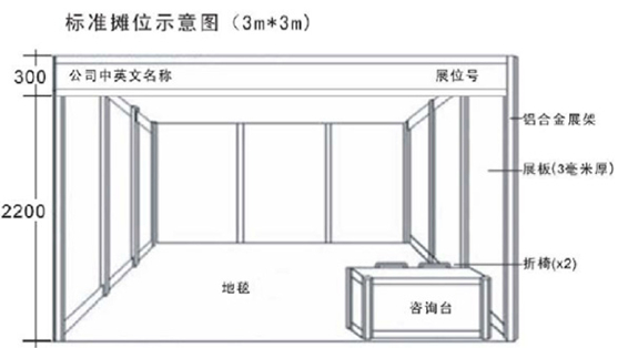 2.标准展位配备1张咨询桌、2把折椅、2支射灯、中英文楣板、1个220V电源、地毯。